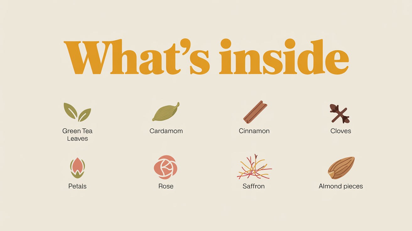 Premium green tea leaves, saffron strands, cardamom, cinnamon, cloves, rose petals and crushed almonds.